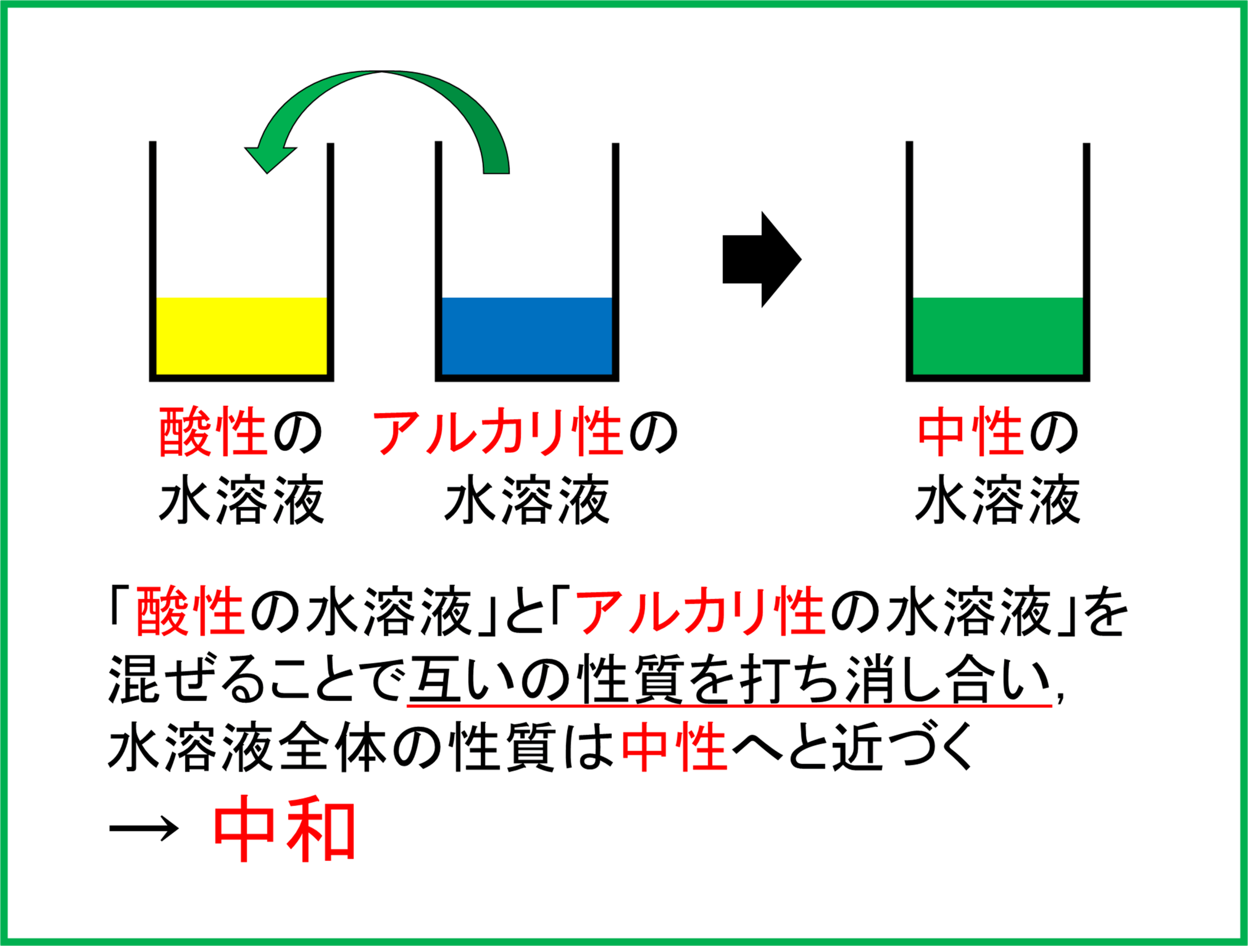 酸性の水溶液とアルカリ性の水溶液を混ぜるとお互いの性質を打ち消すような反応が起こり,水溶液の性質は全体として中性に近づきます。この反応を中和といいます。