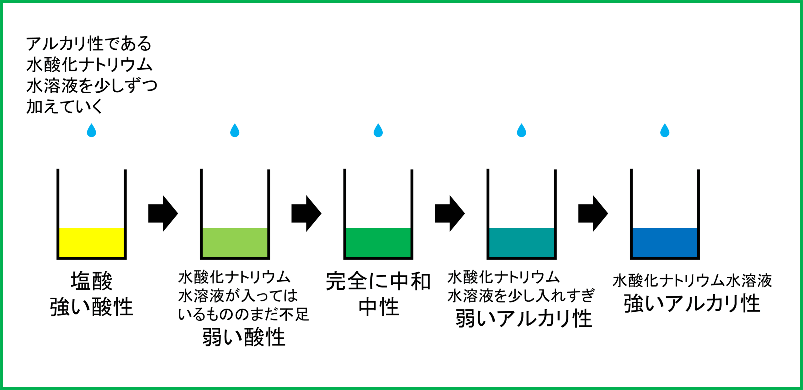 つまり酸性の塩酸とアルカリ性の水酸化ナトリウム水溶液を混ぜることによって水溶液は「中性」へと近づいているのです。