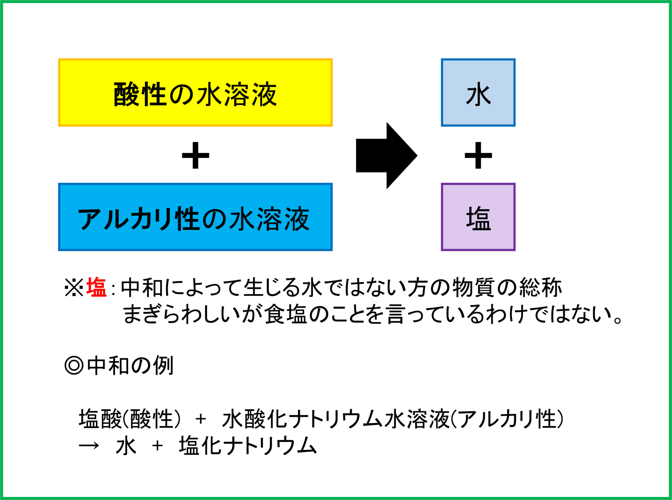 酸性の水溶液とアルカリ性の水溶液を混ぜて中和した場合,まず「水」ができます。そこに加えて「塩(えん)」と呼ばれる物質ができます。