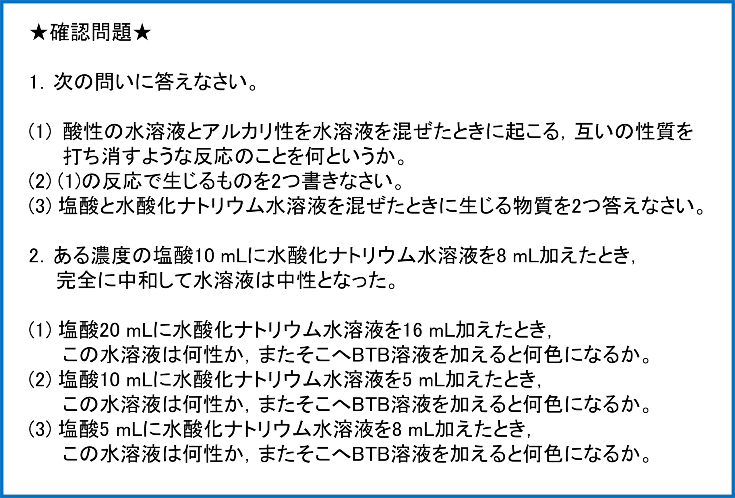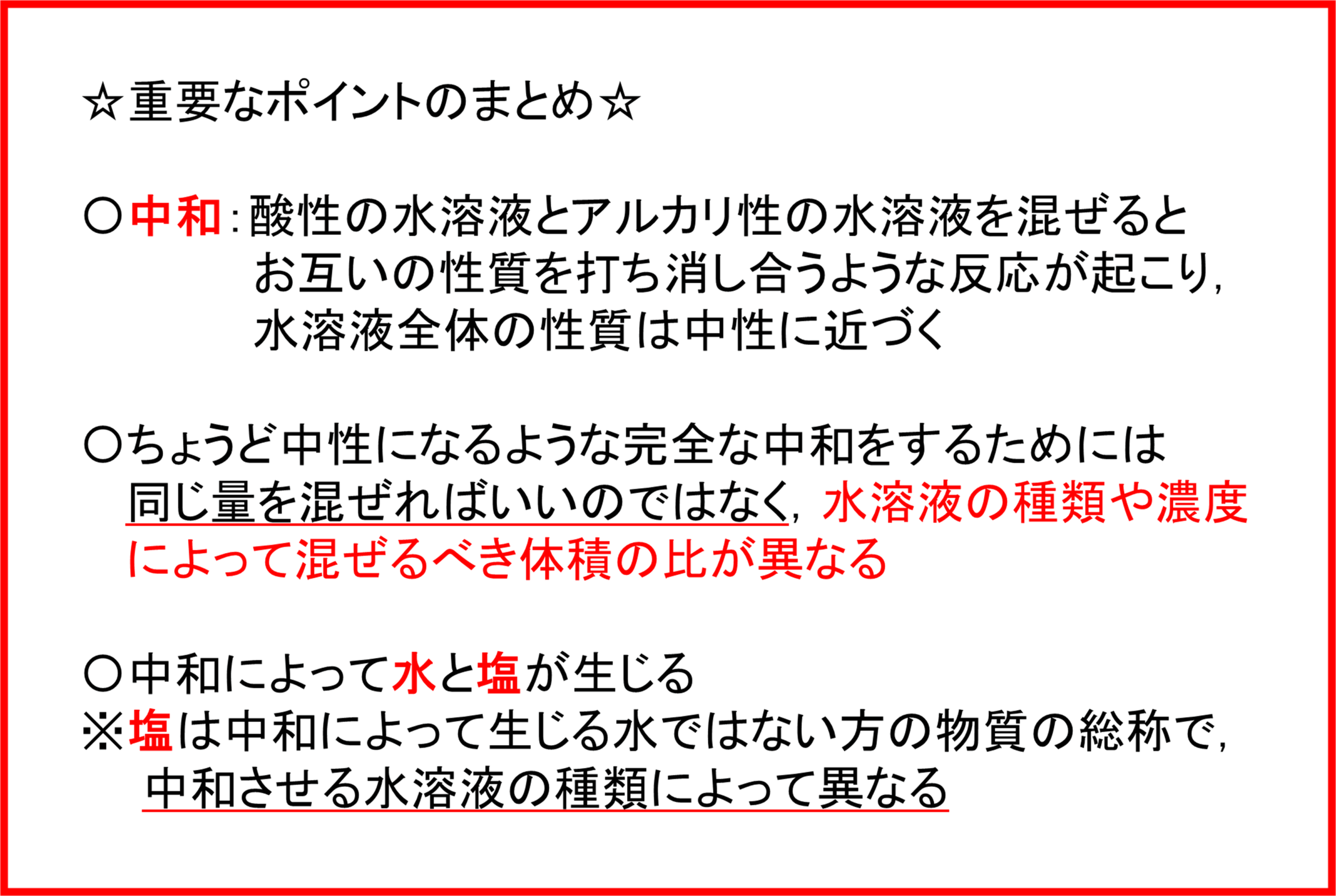 打ち消し合うために必要な水溶液の量は,その種類や濃度によっても違ってくるので問題として広く発展させやすい内容です。またこの性質は実験において酸性の水溶液やアルカリ性の水溶液を廃棄する際にも必要な知識となってきます。
