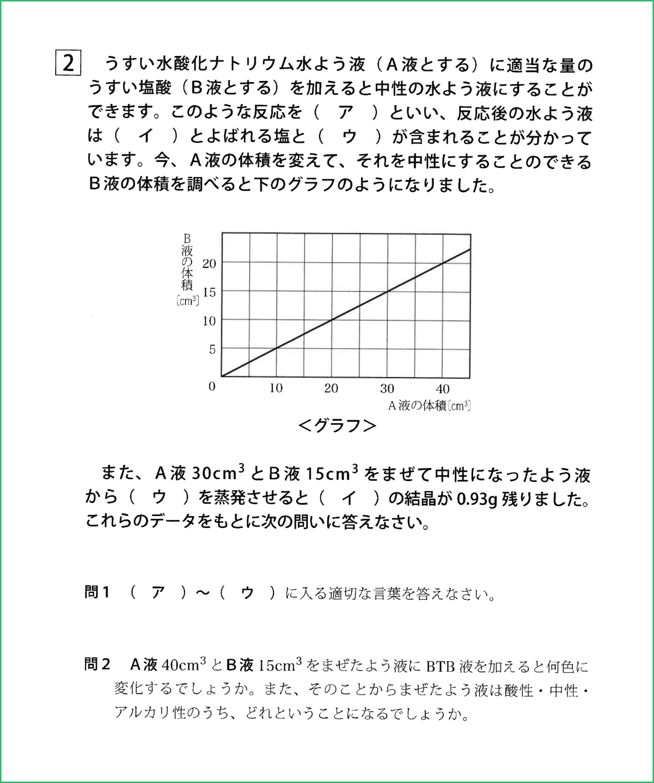 グラフより,A液とB液が2:1のときに完全に中和して水溶液が中性となることが分かります。