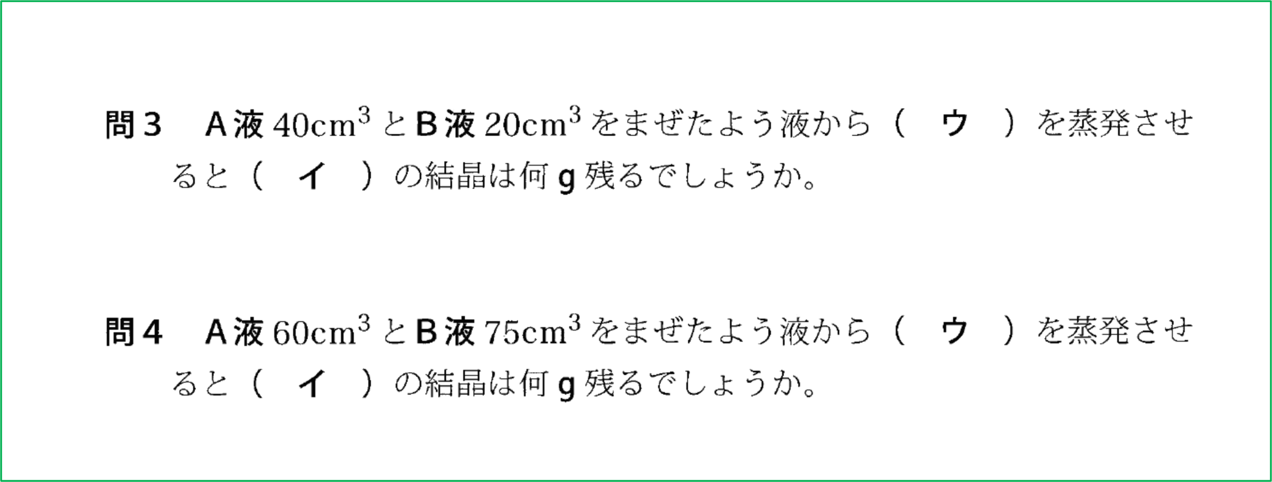 ここで問3と同じように考えると,A液が30 cm3のときは塩化ナトリウムが0.93 g残るので,A液の量がその2倍である60 cm3のときは塩化ナトリウムも2倍の1.86 g生じることになります。