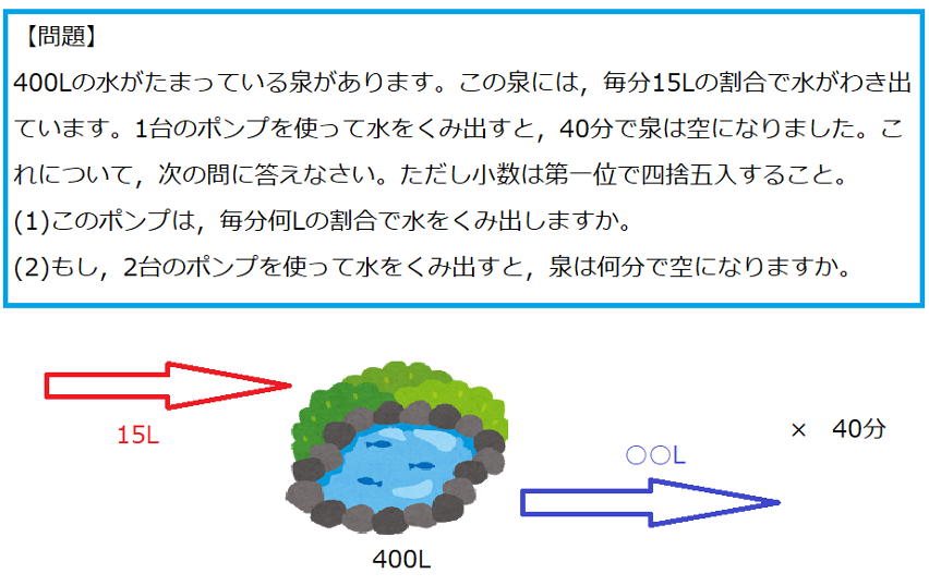 【問題】400Lの水がたまっている泉があります。この泉には,毎分15Lの割合で水がわき出ています。1台のポンプを使ってこの泉をくみ出したところ,40分で泉は空になりました。これについて,次の問に答えなさい。ただし小数は第一位で四捨五入すること。