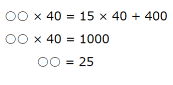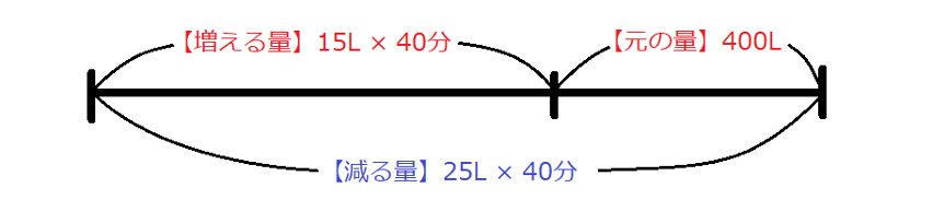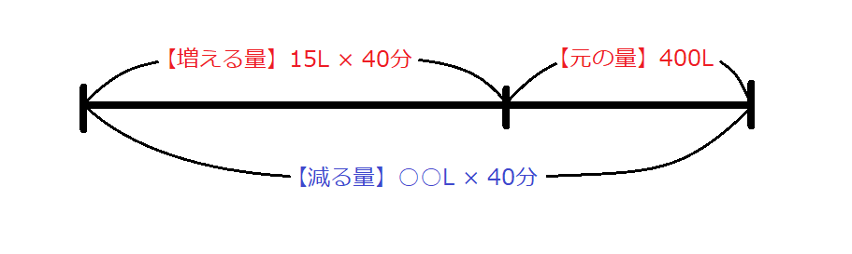 そしてこれらの数値の区別をつけたところで,(1)の問題を解いていきます。元の量400L・15Lの増加・○○Lの減少・40分後に空になる,という情報を一つの線分図に書き起こしてみます。今回はこの図の書き方を覚えましょう。