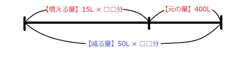 この数値を整理して改めて線分図を書きます。今回はかかる時間を求める必要があるので,すべての水をくみ出すまで□□分掛かるとしましょう。