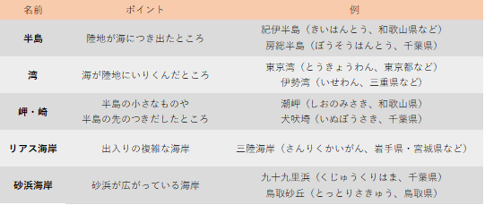 海岸線にはいろいろな種類の地形ができます。陸地から大きくつきだした半島(はんとう)や岬(みさき)・崎(さき)、反対に海水が陸地に大きく入り組んだ湾(わん)などを覚えましょう。
