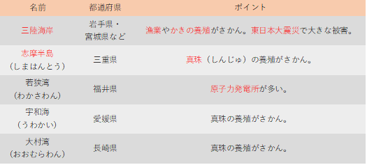 まずは地名です。下の表に大事なリアス海岸についてまとめましたが、この中でも特に三陸海岸は必ず覚えるようにしましょう。