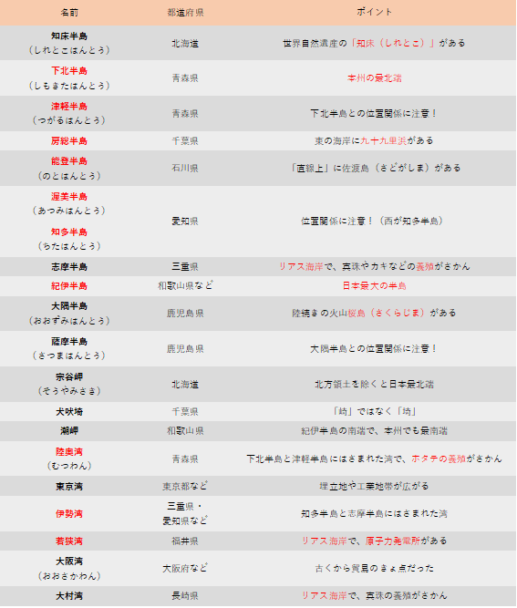 また、下北半島と津軽半島、渥美半島と知多半島などセットで覚えるものの位置関係にも注意しましょう!