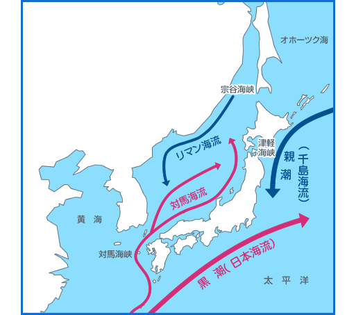 さて、日本のまわりには4つの海流が流れています。暖流(図の赤い矢印)の日本海流(黒潮)、対馬(つしま)海流と、寒流(図の青い矢印)の千島(ちしま)海流(親潮)、リマン海流です。ちなみに、日本海流は透明度が高く黒のような色に見えるので「黒潮」と呼ばれ、千島海流は魚のえさとなるプランクトンがたくさんいるため「親潮」と呼ばれています。