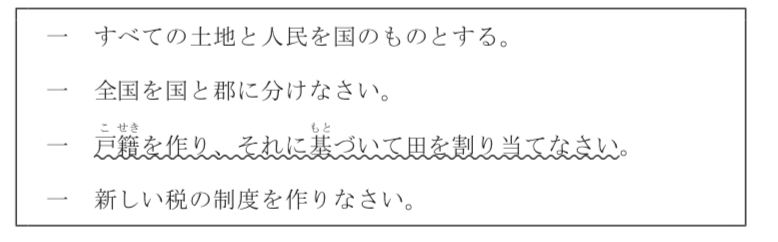 - 基本的な知識問題。大化の改新と一環としてどのようなことが行われたか、それぞれどのような名前かが分かれば良い。