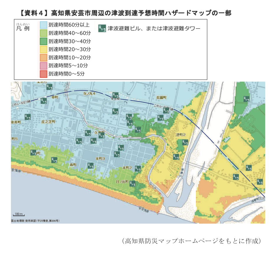 問2 下線部(b)(太平洋に面している)について。太平洋に面している高知県では、地震や津波などの防災対策に力を入れています。【資料4】は、高知県安芸市周辺の津波到達予想時間を表したハザードマップの一部です。【資料4】を読み取り、津波からの避難について考えてみました。