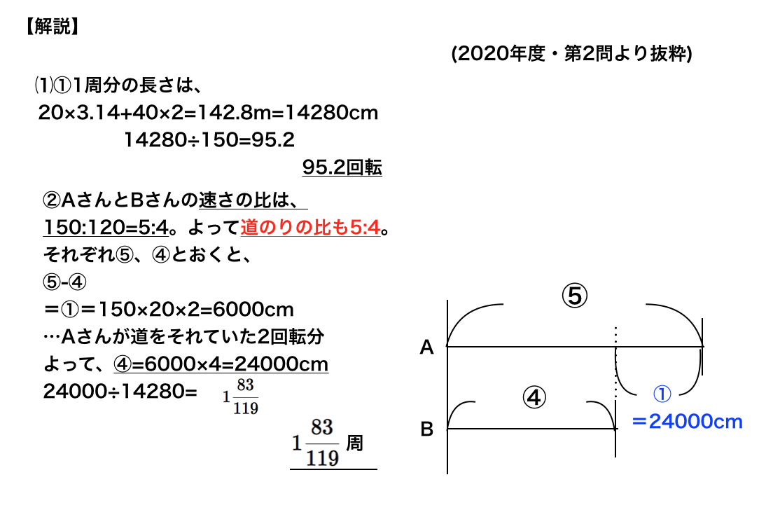 ⑴右の図(本ページでは下部に記載)のようなコースで輪を転がしながら進む競走をします。コースは長方形と、半円を2つあわせた形をしています。Aさんがころがすのは州の長さ150cmの輪、Bさんがころがすのは周の長さが120cmの輪です。輪はすべることなくころがるものとします。