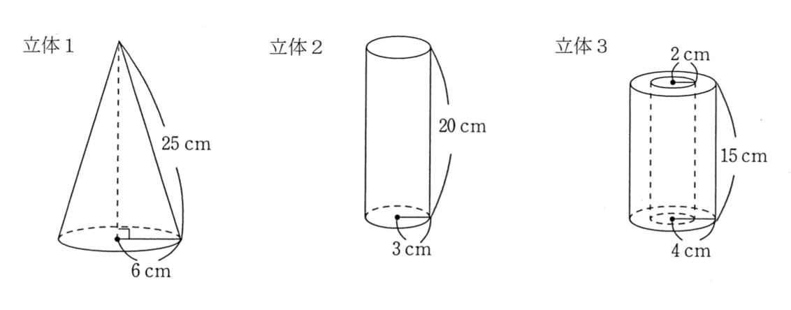 図のような立体1、2、3、がどれも1個以上あります。立体1は円すい、立体2は円柱、立体3は底面の半径が4cmの円柱から底面の半径が2cmの円柱をくりぬいてできた立体です。立体1の底面(下の面)は赤、立体2の底面(上下の2つの面)は青、立体3の底面(上下の2つの面)は黄色にぬられていて、どの立体もその他の面は全て白くぬられています。