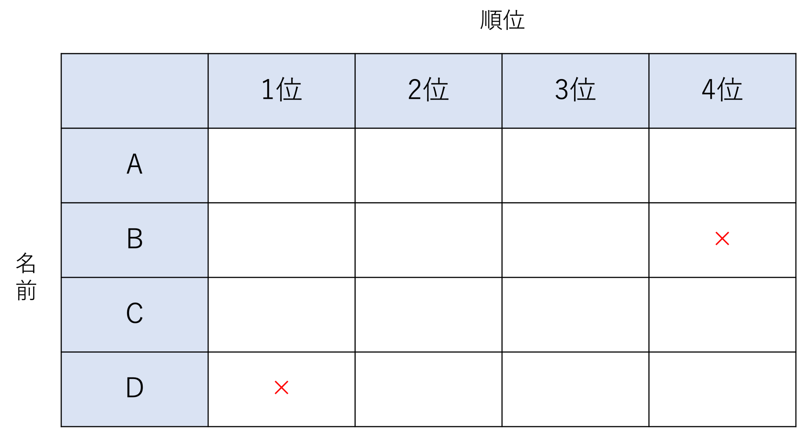 まず大事になってくるのが,大元となる表を用意するということです。普通の図表の整理の問題とは必要となる表の形が若干異なってくるので,表くらい簡単に書けるという自信をお持ちの読者の方も多いでしょうが,順位の問題ではこうやって図を書いていけばいいのかというテンプレートを頭に入れておくといいでしょう。今回はAからDまでの4人が登場し,1位から4位までを決めるということなので,名前を縦・順位を横において表を作れるといいですね。