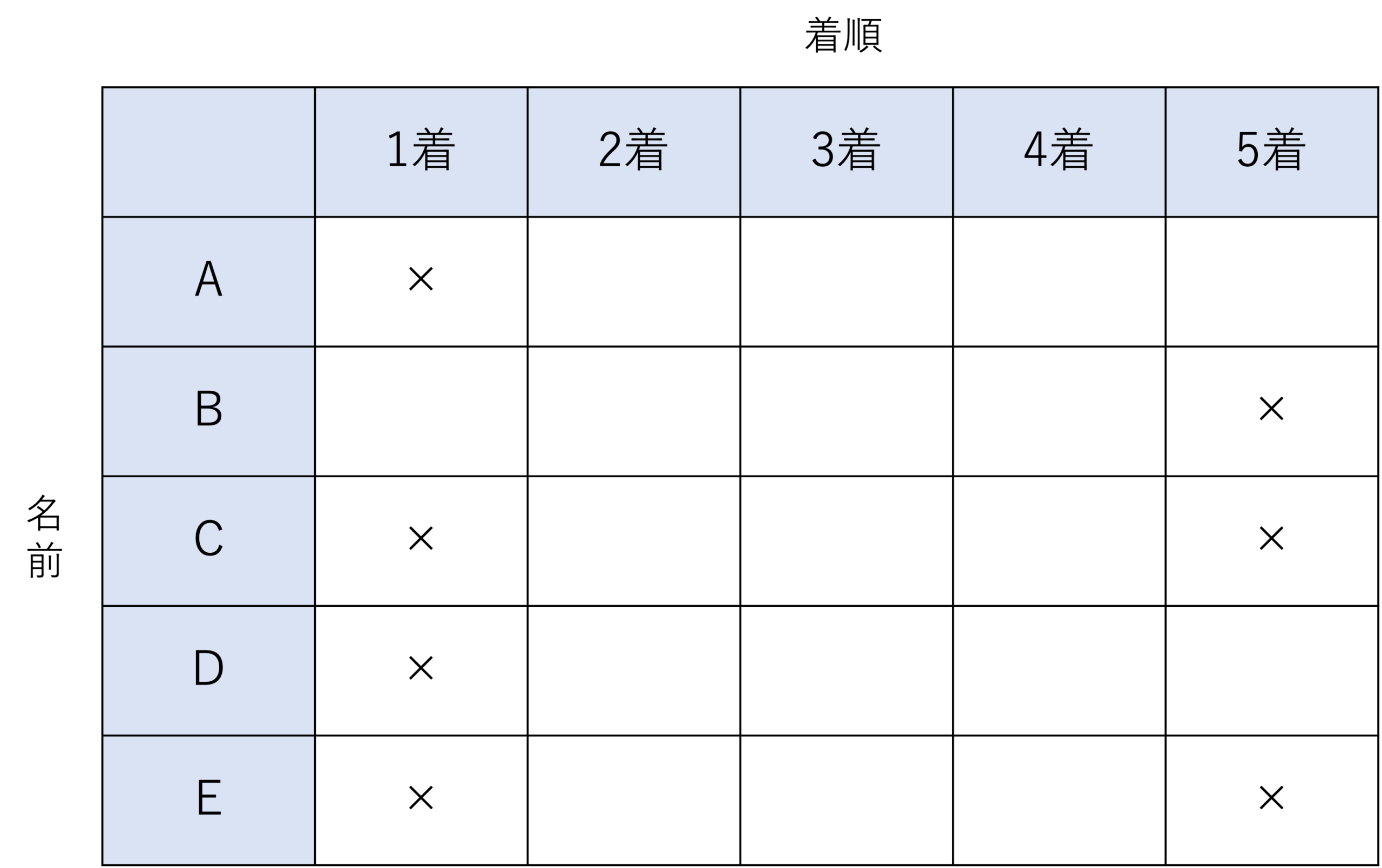いかがでしたでしょうか。この問題は先ほどの例題と比べて参加人数が1人多い上に,かつ問題の形式も「正しいものを選びなさい」という方式になっており,やや難しく感じられた人も少なくないでしょう。しかし,そのような方でも解説をきちんと読んで理解す頃ができれば問題ありません。分かった人は自分の答えを見ながら,分からなかった人は自分の考えを辿りながら,一緒に確認していきましょう。まずは表の作成に取り掛かっていきます。今回は次のようなものを作ることができたらいいですね。ない今回の問題では4つ目の条件として「同着の順位のものはいない」ことが挙げられています。それゆえ1位から5位までを順番に表に書いていけばいいのですが,もし同着が存在する場合は表の書き方を少し変えなければなりません。中学受験で同着の場合が登場することは滅多にないので省略しますが,そういった問題もあることだけ頭の片隅に置いておくといいかもしれませんね。