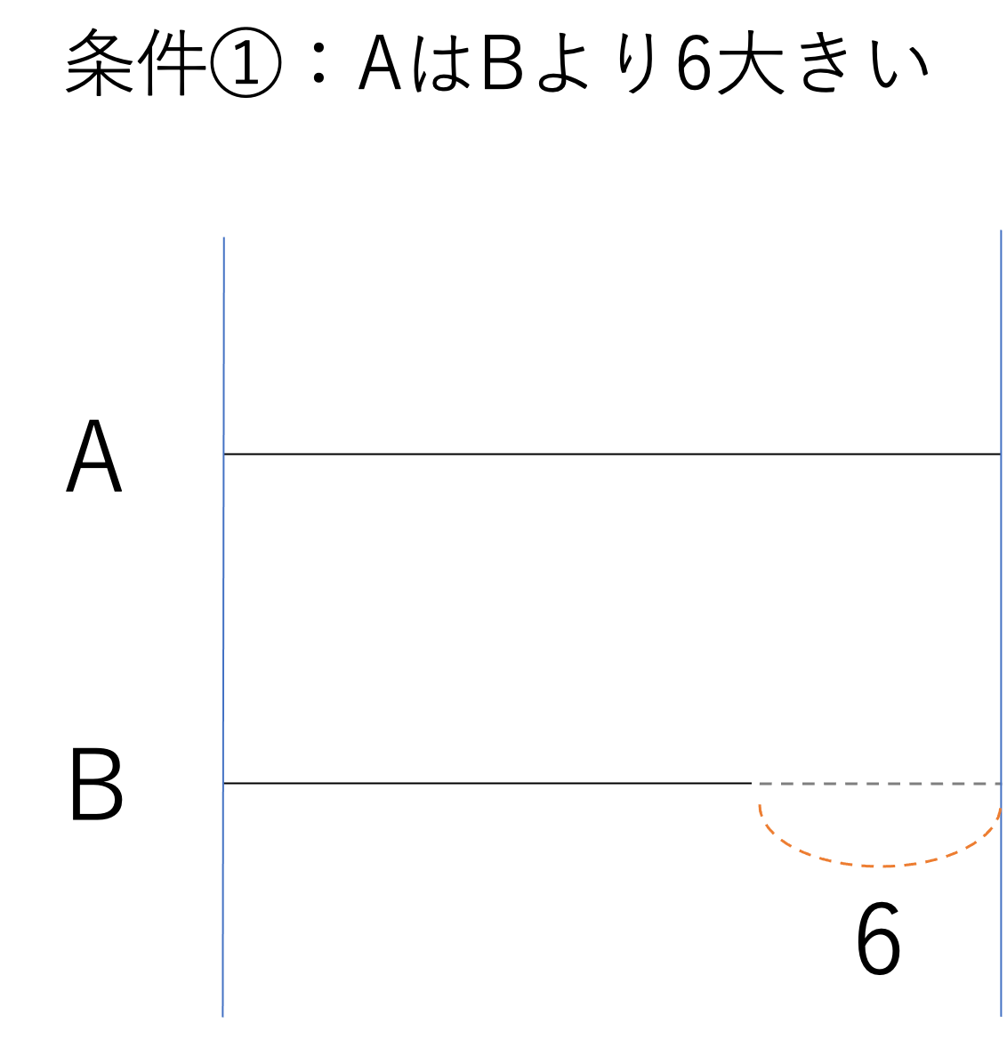 まずは①のAはBより6大きいという条件について考えていきましょう。といってもこの条件はそこまで難しく考える要素のない条件ではありますので,次のようにAを表す線分を1本書き,そのAと比べながらBを表すのに適切なぐらいの長さの線分を引いてあげれば問題ありません。簡単なところはとことんまで省略しながら,短い時間で正解に辿り着く努力を怠らないようにしましょう。