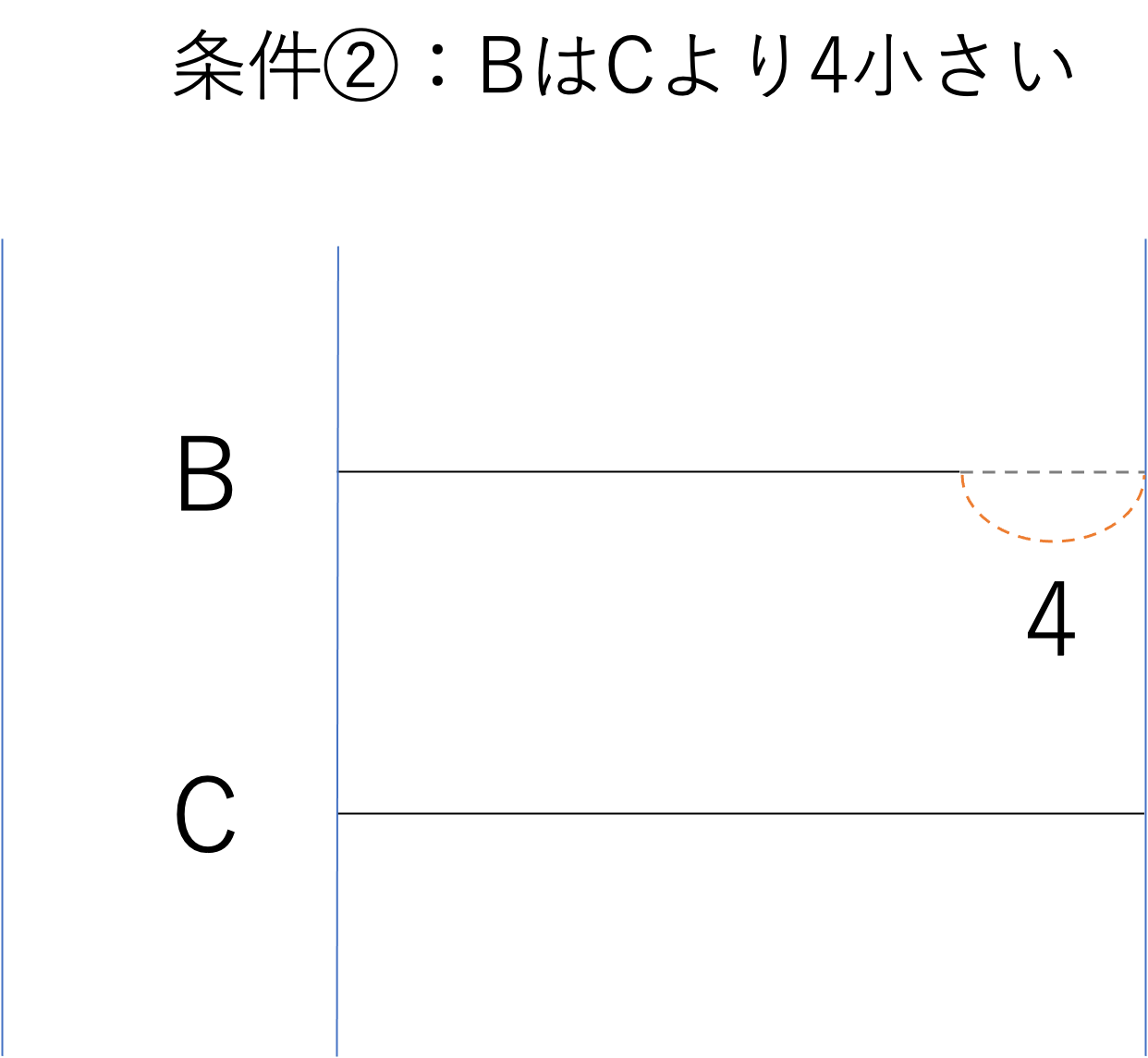 この調子で条件②についても考えていくと,次のような線分図を得ることができます。なおこれらの条件を考えていくとき,慣れてしまえば大丈夫かもしれませんが,何が何より大きいのか・小さいのかという言葉遣いにはきちんと注意しておく必要があります。「AがBより」と「AよりBが」では意味が反対になってしまうように,こういう読み取りにおけるケアレスミスが命取りになりやすいのがこの単元です。気をつけながら解き進めていきましょう。
