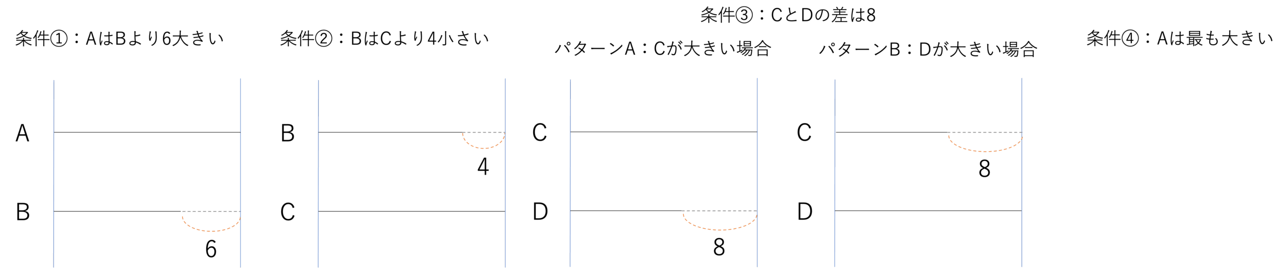 ①AはBより6大きい,②BはCより4小さい,③CとDの差は8,④Aは最も大きい