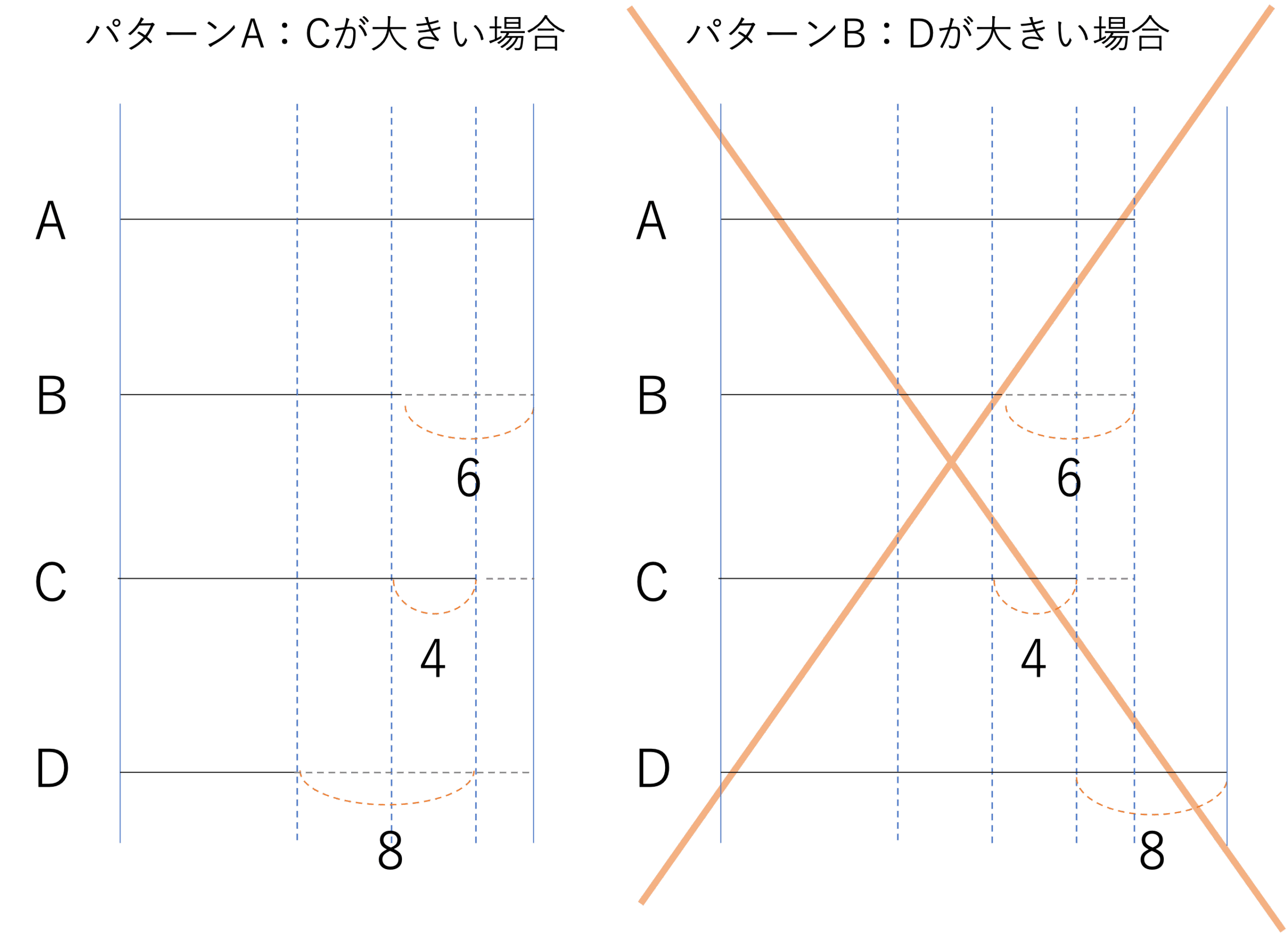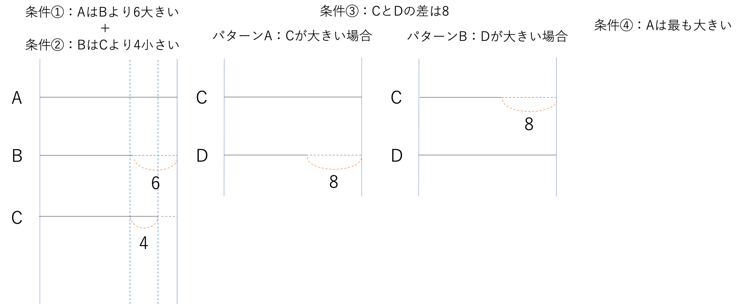 では続いて③の条件も線分図に,と進めていきたいところですがここで大きな問題が出てきてしまいます。この「CとDの差は8」という条件ですが,これだけだとCの方が大きいのかDの方が大きいのか判断することができません。このように調べ・推理・条件の整理の問題では,いくつかの場合が考えられるという状況が登場しやすいです。というよりも,そのような複数考えられるパターンを他の条件と照らし合わせることで削っていく,ということに出題者の意図があると考えてもらった方がいいでしょう。そのため今回の問題でも,一旦③の条件のみを考えるステップでは2パターンの線分図を書くことで,中身を整理することに集中していきましょう。