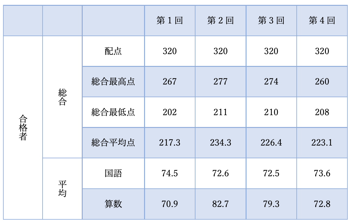 満点・受験者平均点・合格者平均点・合格者最高点・合格者最低点