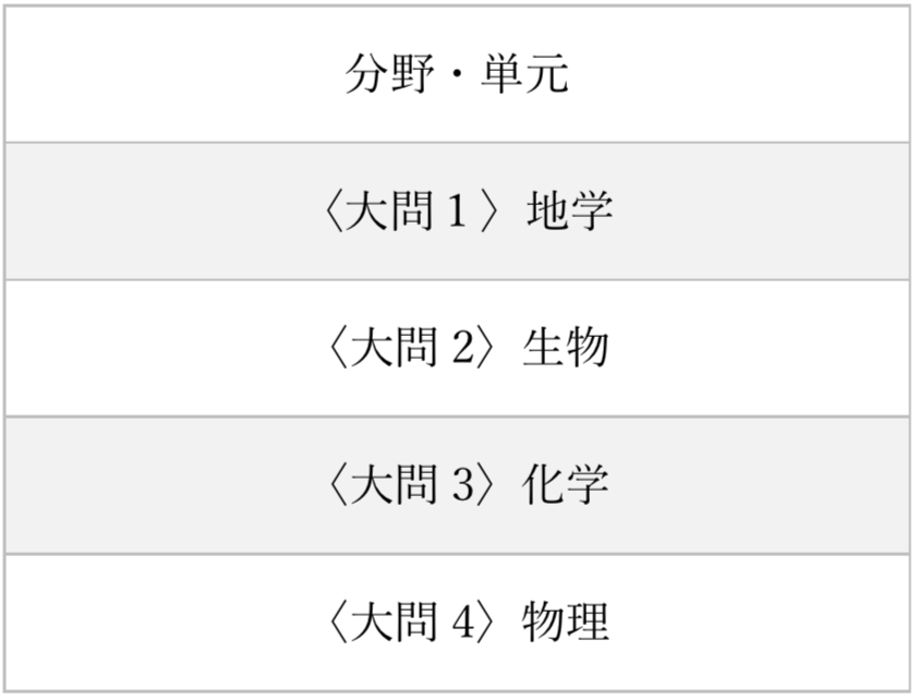 基本的には物理・化学・生物・地学の4分野からそれぞれ1問ずつ出題されており、同じ分野から複数問出題されるということはほとんどありません。