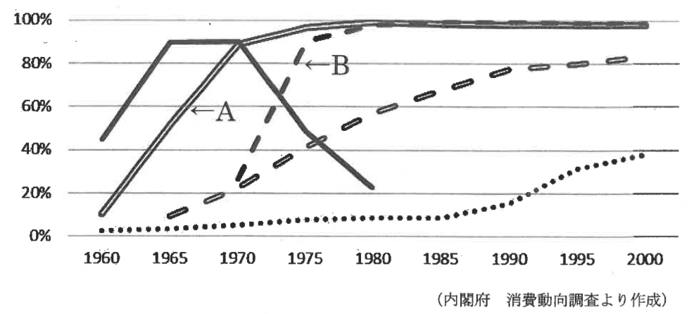 問3 下線部③に関連して、高度経済成長以降、家庭生活の様子は大きく変わり、さまざまな電化製品などが普及しました。5つの製品の普及率を示した次のグラフを見て、A・Bにあてはまるものをそれぞれ選び、記号で答えなさい。