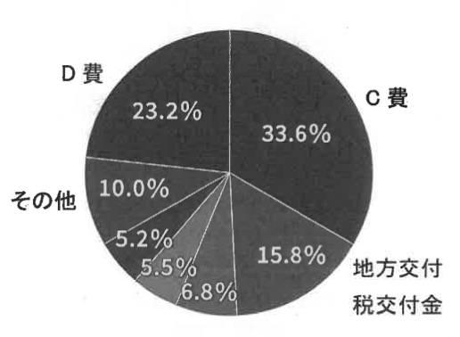 問5 下線部⑤について、右のグラフは、国の一般会計予算(2019年度)の歳出の内訳(割合)を示したものです。C費の額は、社会の変化にともなって30年前の約3倍になっています。また、D費の割合が増加すると、国がさまざまな政策を実施するためのお金が減ることになります。グラフ中のC・Dにあてはまるごくをア〜オよりそれぞれ選び、記号で答えなさい。