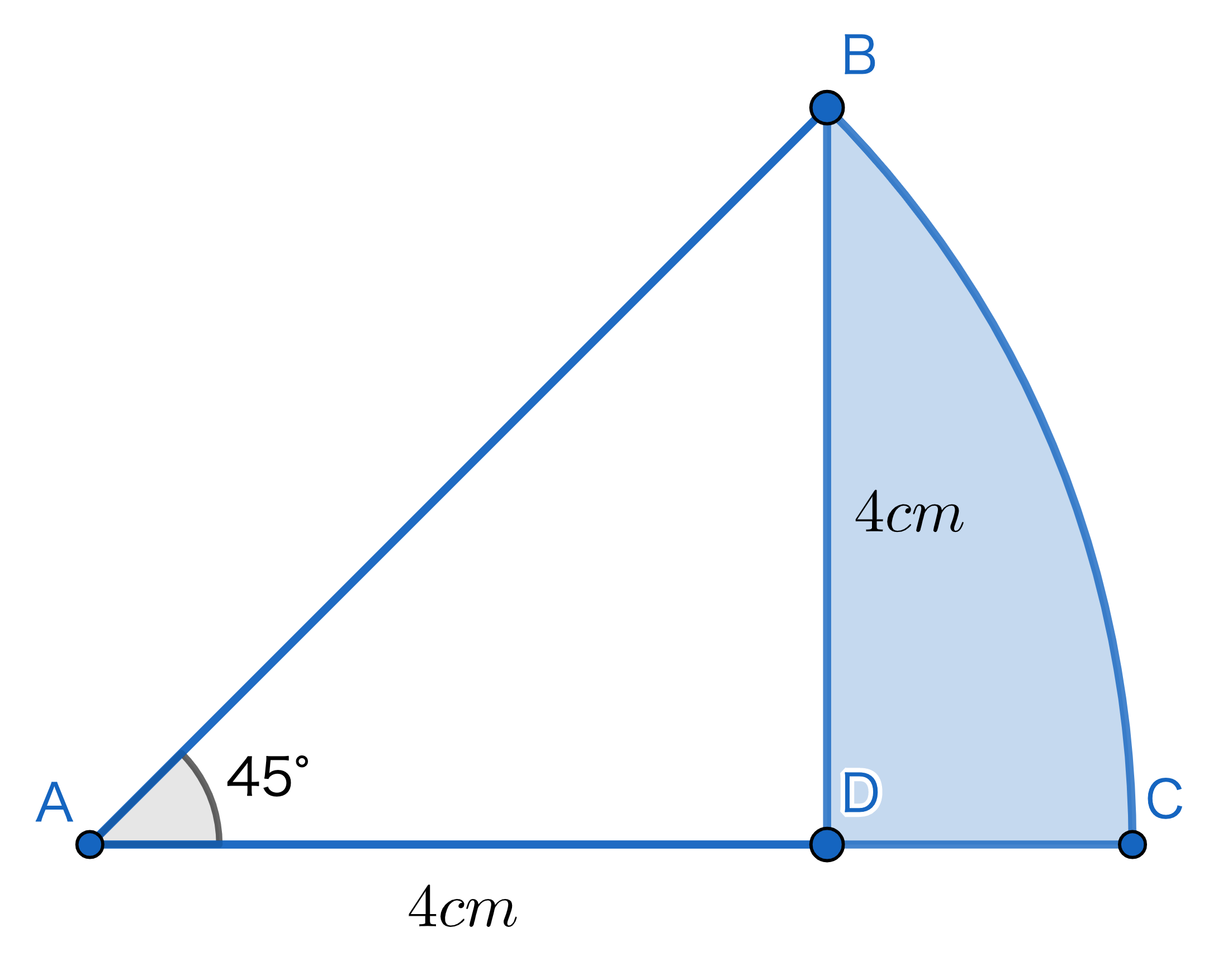 図は半径4cm,中心角が45°のおうぎ形と二等辺三角形を組み合わせた図形です。AD=BDのとき,色のついた部分の面積を求めなさい。ただし,円周率は3.14とします。(慶應義塾中等部(2015),一部改題)
