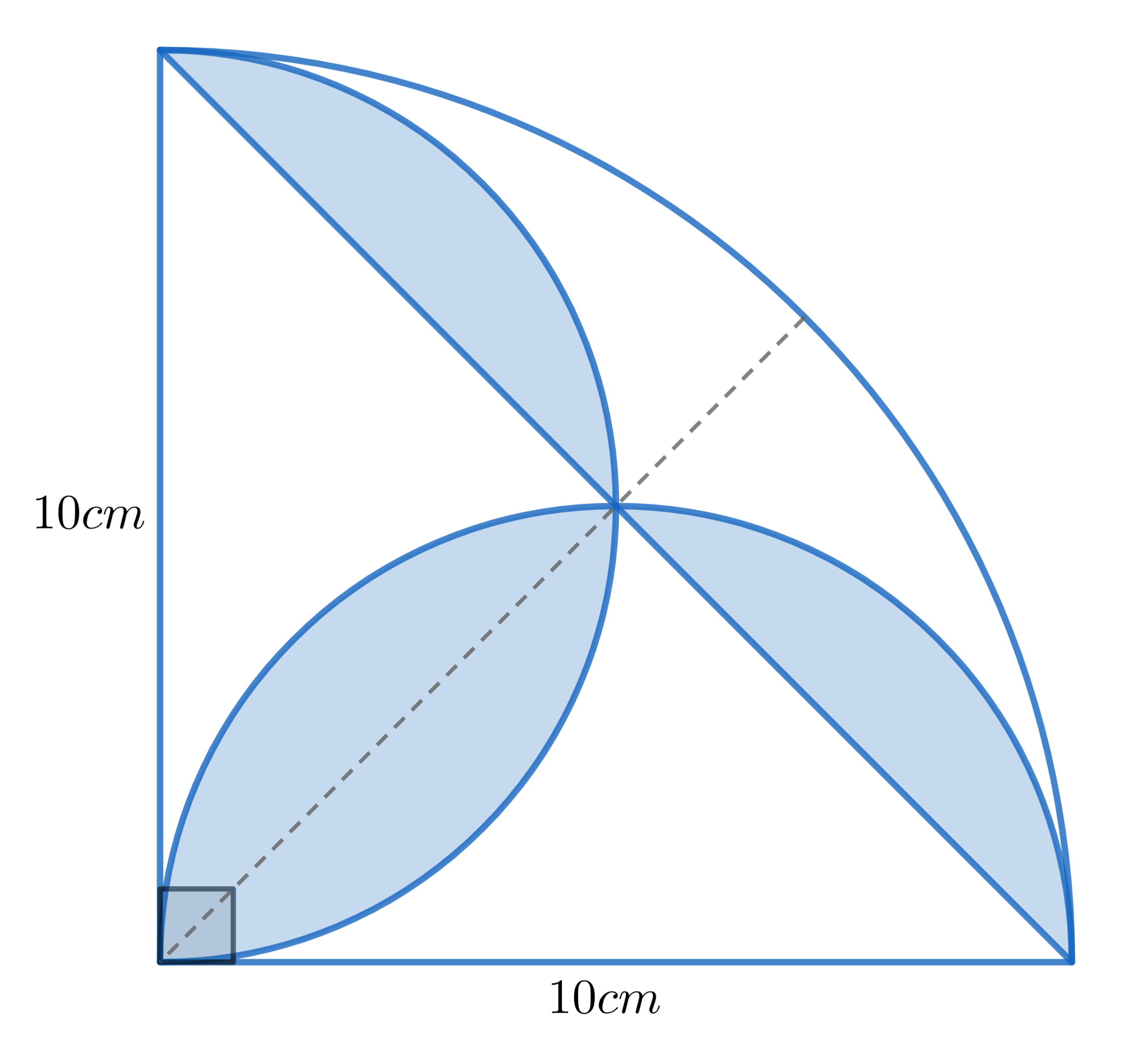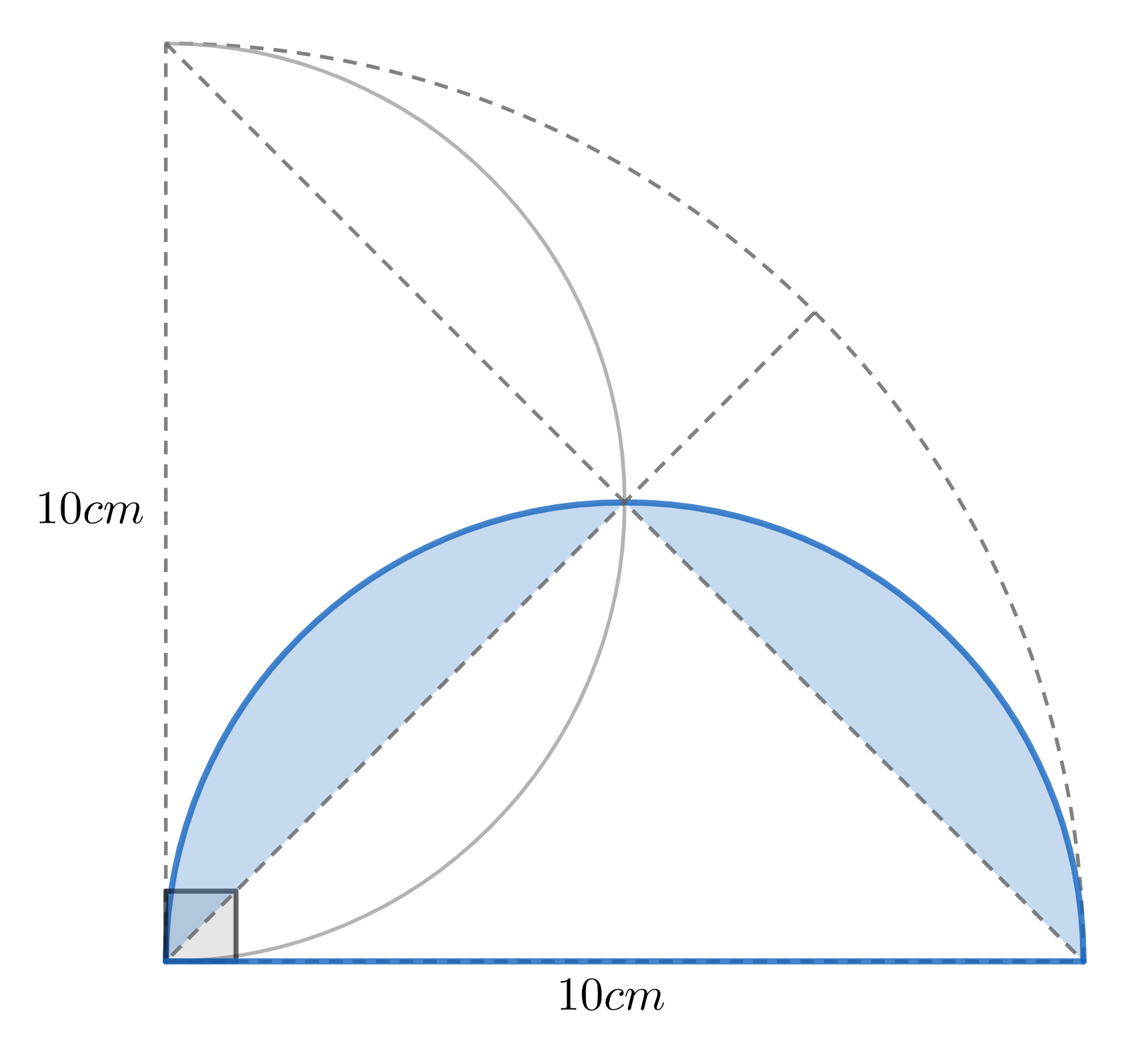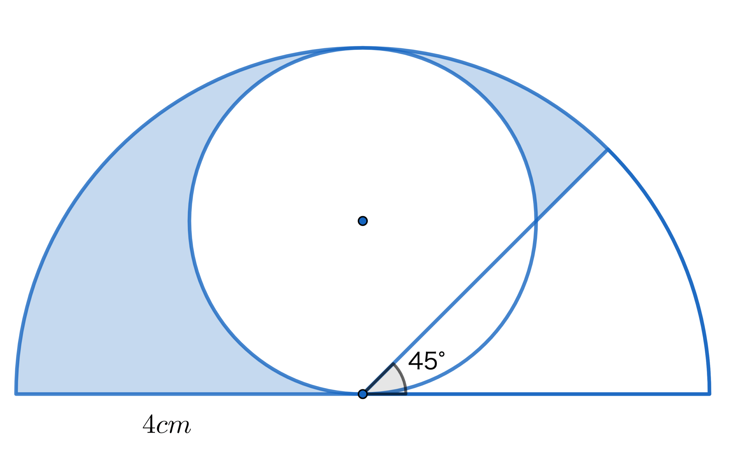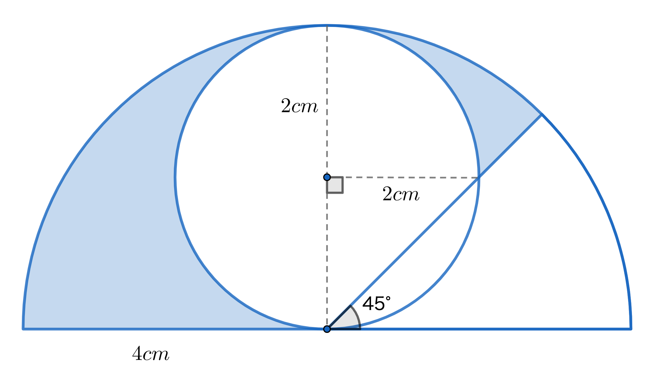 下の半円に注目すると,元から提示されている直線と新たに引いた補助線により,半円は直角二等辺三角形と潰れた半円2つに分割することができます。つまり半円から三角形の面積を引くことで,2つ当たりの面積が求まるわけです。そしてその2倍として色のついた部分を考えることができます。