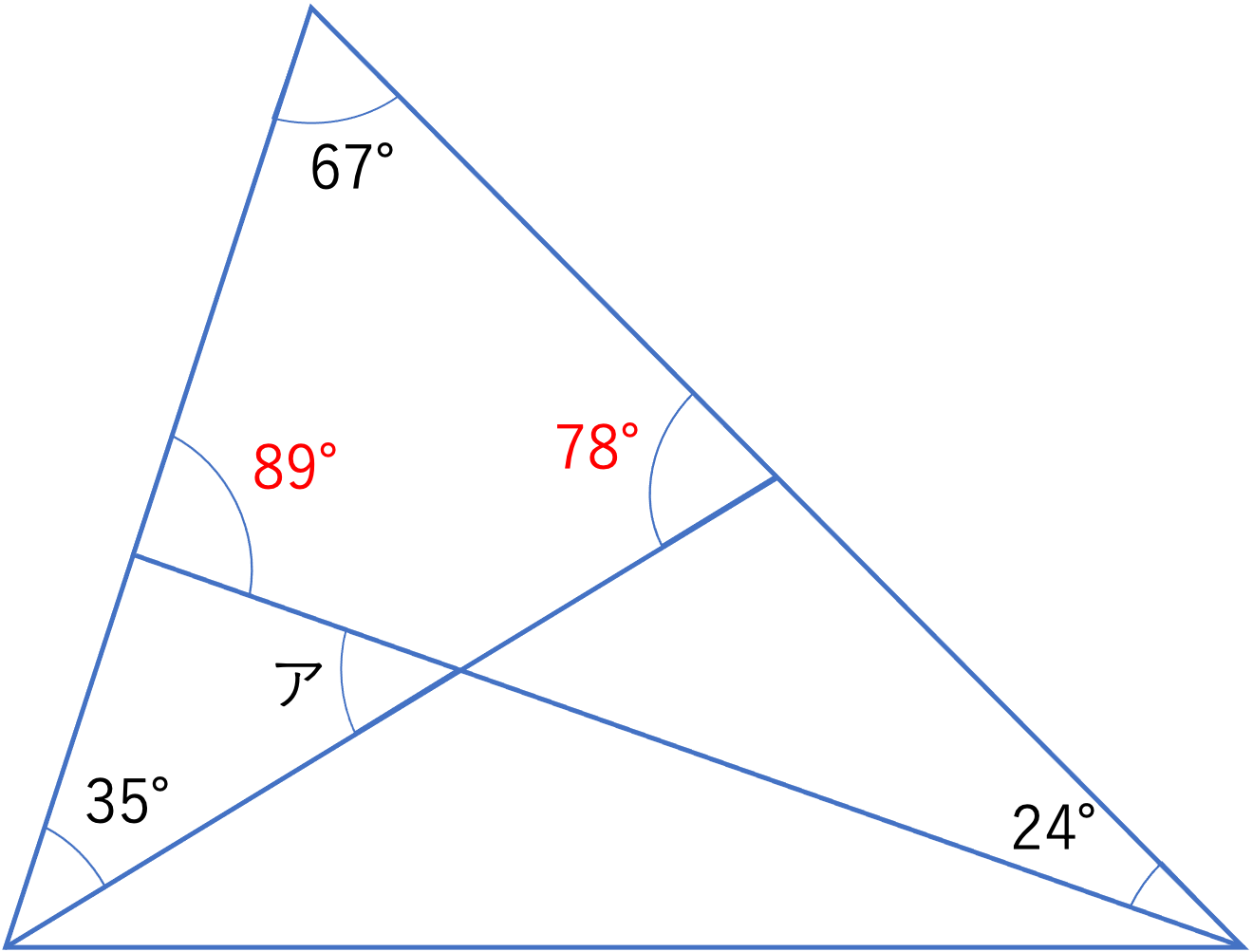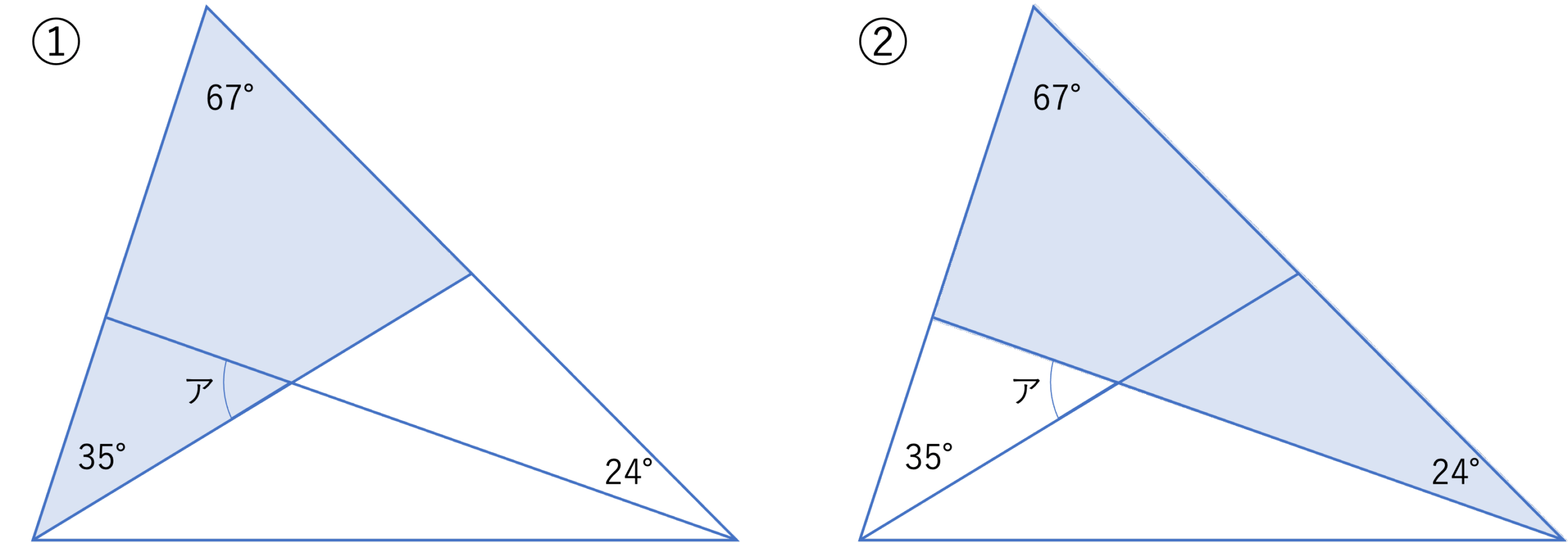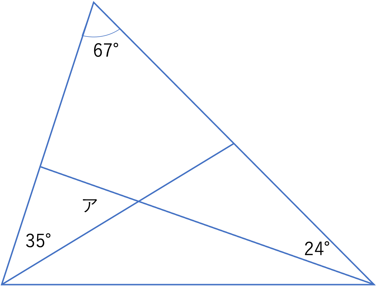 それではここからは解説を行なっていきます。答えが出せた・出せなかった,正解した・しなかったにかかわらず,参考にしていただけますと幸いです。まず今回の問題ですが,三角形の中に2本の線が引かれており,その中に存在する角度の大きさを求めるという構造になっています。このように図形の内部に線が引かれているときはその線に沿って図形を切り分けたり,また切り分けた図形を組み合わせたりしながら,少しずつ角度を埋めていくことが大切になってきます。今回の問題でも67°・24°・35°という3要素からアの角度をいきなり求めるのは難しいので,まずは下の図のように,上の大きな三角形の中に存在する2つの三角形に注目していきましょう。