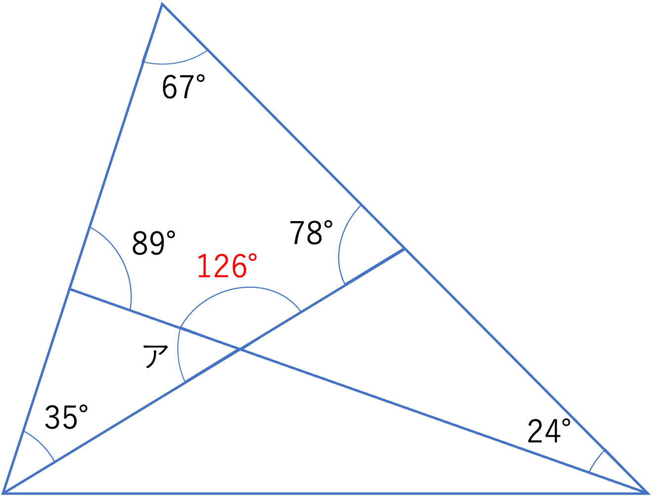 この四角形では67°・78°・89°という3つの角度の情報が与えられています。そして四角形の内角の和は360°なので,360°-(67°+78°+89°)=360°-234°=126°という計算から残った1つの角度が126°だと計算できますね。