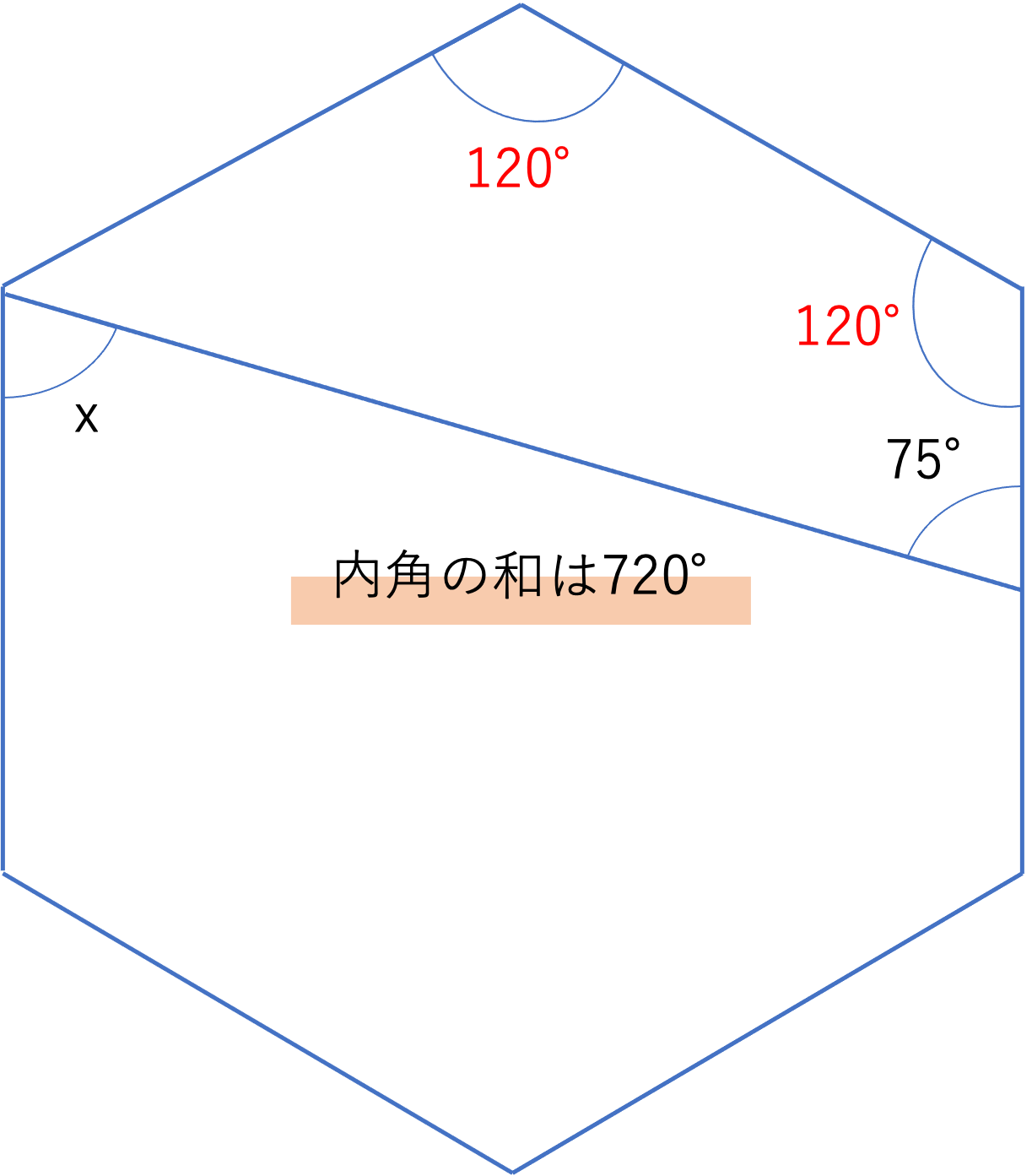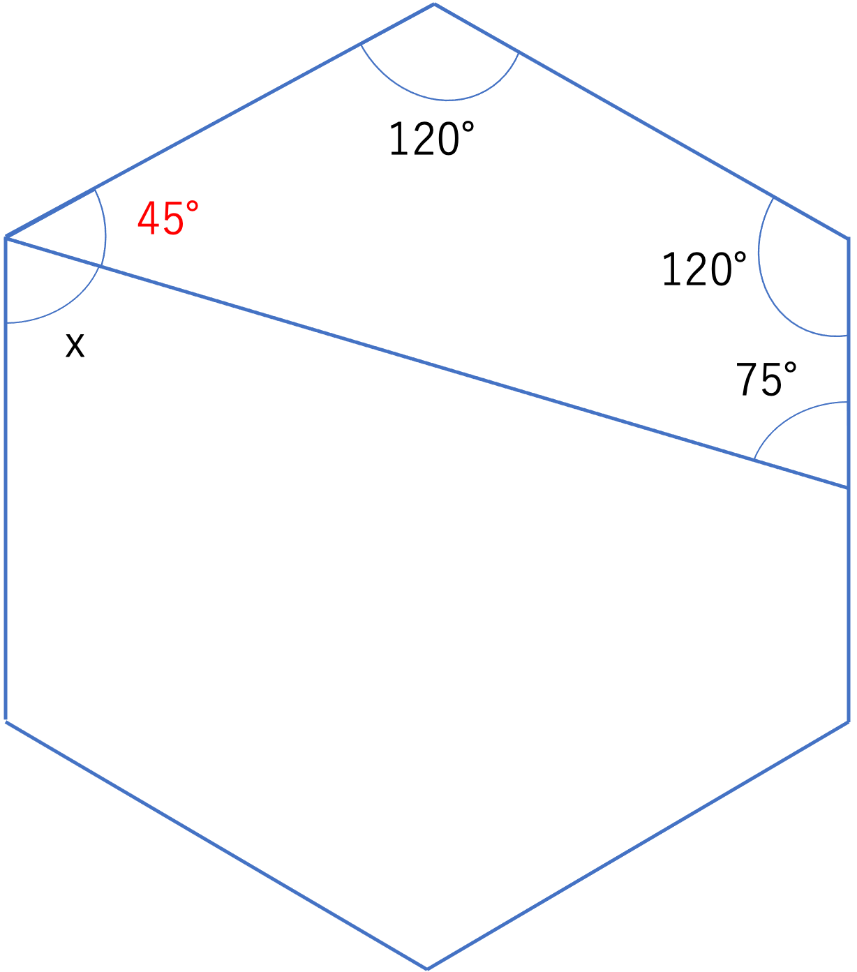 さてこの図に基づいてxの値を考えていくわけですが,ここで先ほど同様に1つだけ角度の値が分からない図形があるかどうかを考えていきましょう。今回だと六角形の上部に120°・120°・75°という3つの角度が分かっている四角形を作り出すことができますね。この図形の残りの1つの角度が内角において角xの反対側に存在するため,利用することで答えを求める上で必要となる情報を埋めていきましょう。ここで四角形の内角の和は360°なので,残りの1つの角は360°-(120°+120°+75°)=360°-315°=45°であることが分かります。