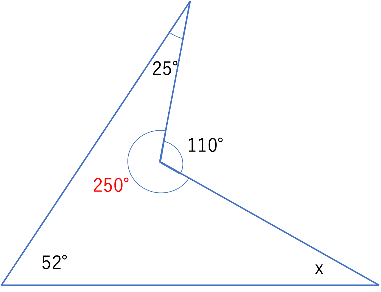 そしてこの部分の内角が求められたので,図の四角形のうち大きさがわからない角度が1つだけになりますね。このことから内角の和の大きさの関係を使って答えを求められそうです。四角形の内角の和は360°なので,xの大きさは360°-(25°+52°+250°)=360°-327°=33°となります。