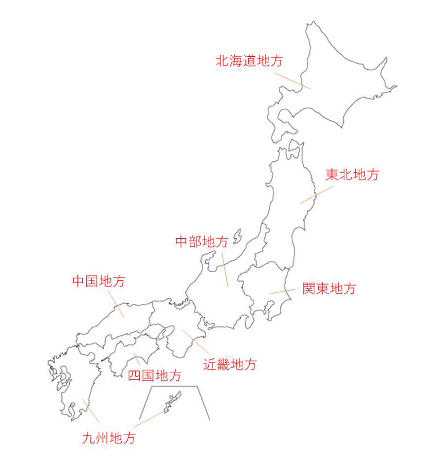 各都道府県は上の図のような8つの地方に分けられます。それでは、各地方の都道府県について見ていきましょう。