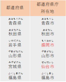 東北地方は6県が置かれています。岩手県や福島県など面積の大きい県が多いですが、人口100万人以上の都市は宮城県の仙台市だけです。秋田県と岩手県、山形県と宮城県の位置関係にも注意しましょう。