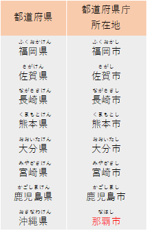 最後は九州地方です。四国とちがい、「九州」という名前ですが県は8つしかないので注意しましょう。沖縄県も九州地方にふくまれています。もっとも大きい都市は福岡市で、人口は150万人をこえています。