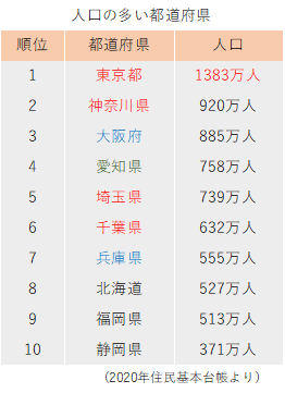注意すべきポイントは、大阪府より神奈川県の方が人口が多いことです。昔は大阪府が人口第2位の府でしたが、上のように神奈川県から東京へ通勤する人が増え、神奈川県の人口が大阪府を抜くこととなりました。