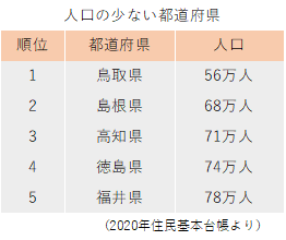 続いて、人口の少ない都道府県です。島根県や鳥取県など山陰地方、高知県や徳島県といった四国地方の県で人口が少なくなっています。これらの県では都会へ移動する若者が多く少子高齢化が進み、人口の減少が問題化しています。