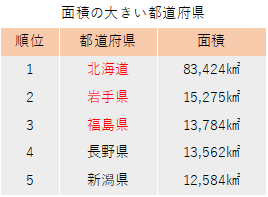 面積が最も大きいのは北海道です。北海道だけで九州よりも大きい面積を有しています。また、東北地方の岩手県や福島県も面積が非常に大きな県です。