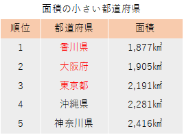 反対に、面積が最も小さい都道府県は香川県です。かつては大阪府が一番小さな都道府県でしたが、埋め立て地が増えたことにより香川県の面積を抜きました。大阪府や東京都、神奈川県は人口の多い都道府県であり、人口密度がとても高くなっています。