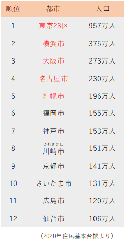 人口が100万人以上の「百万都市」は東京23区を除いて11個あります。これらの都市は覚えるようにしましょう。