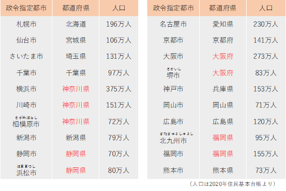 神奈川県からは3つの市が、静岡県・大阪府・福岡県からは2つの市が政令指定都市となっています。また、四国地方には政令指定都市がありません。この中では熊本市が最も新しく、2012年に指定されました。この表を見ても分かるように、実際には人口70万人以上の市が政令指定都市となっています。