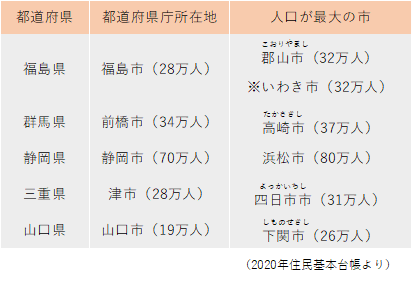 多くの都道府県では、都道府県庁所在地がその県内での人口最大都市となっています。しかし、福島県や群馬県、静岡県、三重県、山口県の5県では県庁所在地ではない市の人口が最も多くなっています。