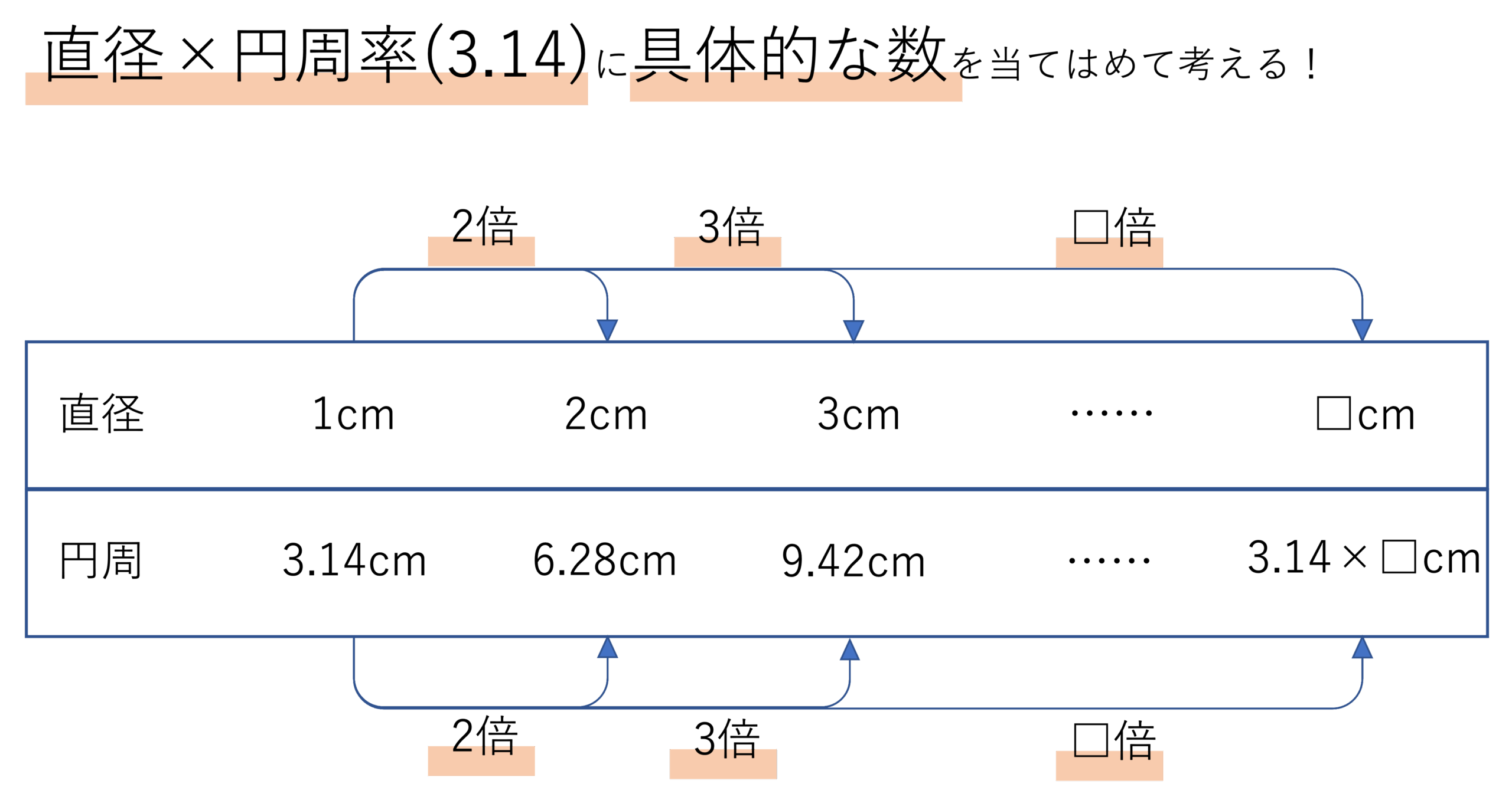 いま直径が1cmだったとします。円の周の長さの求め方は直径×円周率(3.14)でしたので,この公式に基づくと円周は3.14cmになります。次に直径が2cmだとするとどうなるでしょうか。このときの円周は2×3.14で6.28になりますね。いまこの1cmの場合と2cmの場合を比べると,直径が2倍になっていて,同じように円周も2倍になっていることが判断できます。このように1cm,2cm,3cm …と数を増やしていくと,直径が2倍,3倍,…になると円周も2倍,3倍,…になることがわかります。それゆえ直径と円周の関係は比例だということになりますね。このように具体的な数を当てはめていくと問題の答えを導くことができます。