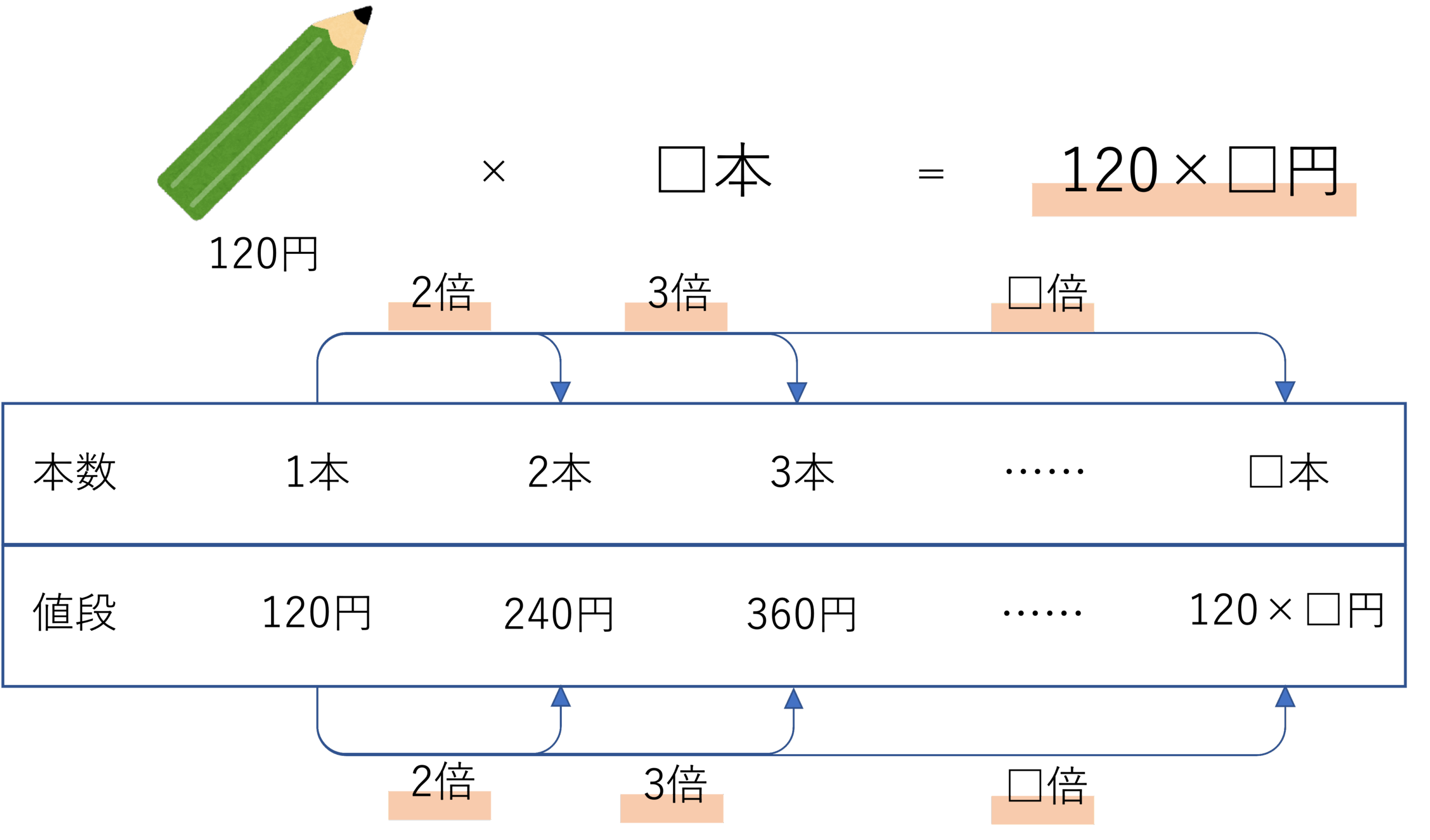 いま鉛筆を□本買ったとしましょう。このときの値段は,当然のことに思えるかもしれませんが,鉛筆の値段を□倍したものになります。よって120×□円になる,という答えが導き出せるわけですね。これらのことをまとめると下の図のようになります。比例の単元は慣れないうちは分かりにくいかと思いますので,1本ずつ本数を増やしていくことから取り掛かると良いでしょう。