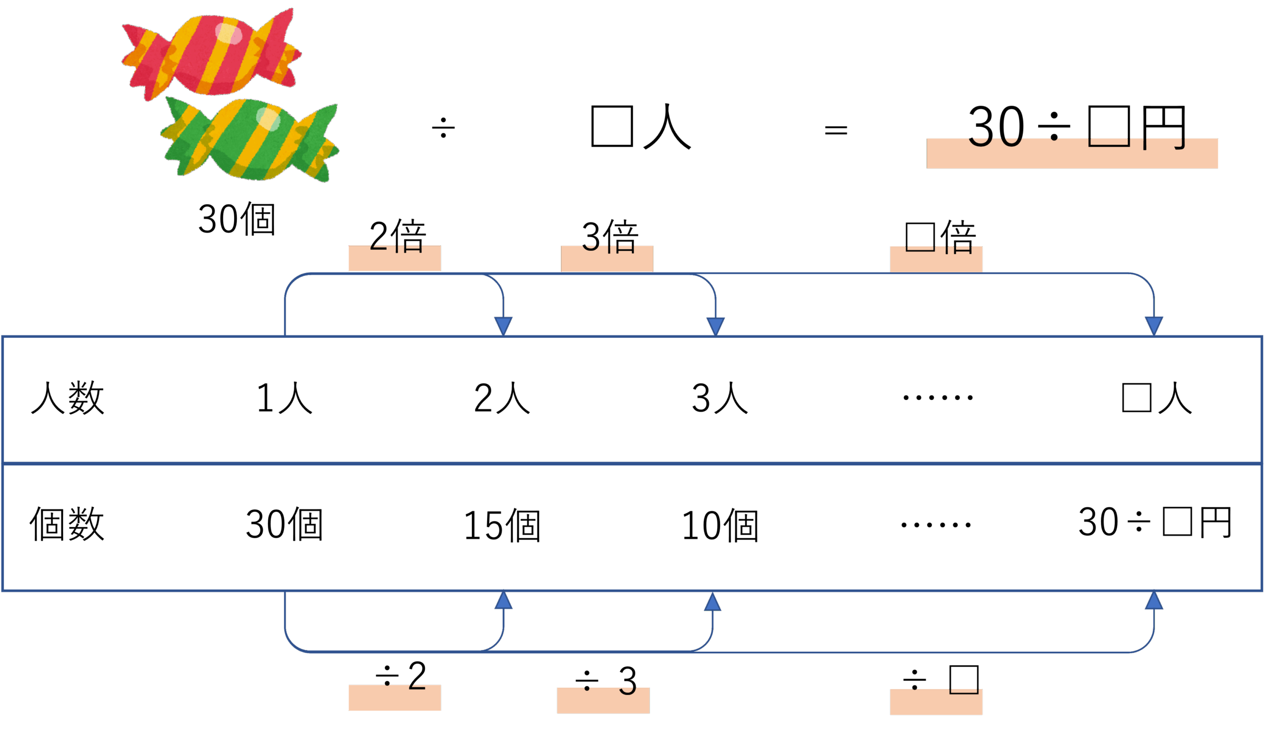 いま□人で30個のアメを分けたとしましょう。このとき1人当たりに配られるアメの数は,30個という数を□で割ったものになります。よって30÷□個が1人あたりに配られる数になる,と導き出せるわけです。これらのことをまとめると下の図のようになります。またここで一緒に覚えて欲しいことが,人数と個数をかけ算したら一定の数になるということです。今回であれば1人×30個=30,2人×15個=30,…と元々あった30個というアメの数に等しくなりますね。割り算による関係性とかけ算による関係性を両方理解しておくといいでしょう。