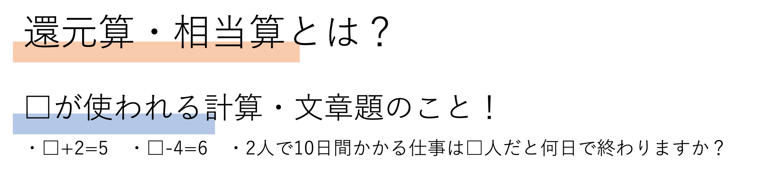 いま上で取り上げた2つの問題のように、□が含まれる計算が還元算・相当算のことを意味します。厳密に言えばこの例題はただの式でしかなく、このような□が含まれる式を組み立てる必要がある文章題のことが還元算、そしてそのうち特に割合が関係するものを相当算というのですが、ここでは大雑把に還元算・相当算とは□を使う計算のことだ、と覚えてしまうといいでしょう。