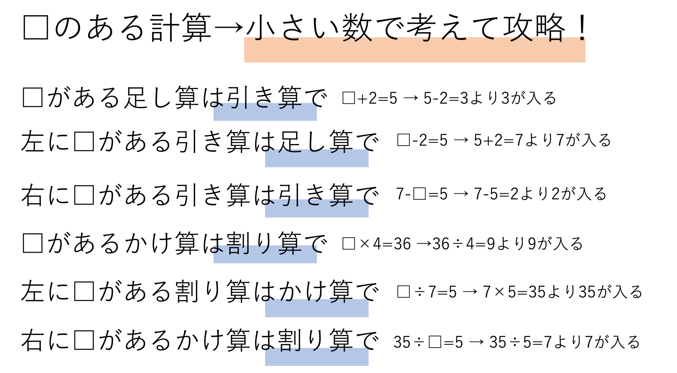 このように複雑な計算の一部としてみるとわかりにくいことでも、小さい数を使うことで簡単に整理することができます。もし入試問題を解く上で□のある問題につまずいてしまったら、小さい数を使って一度計算の方法を確認してみるといいでしょう。