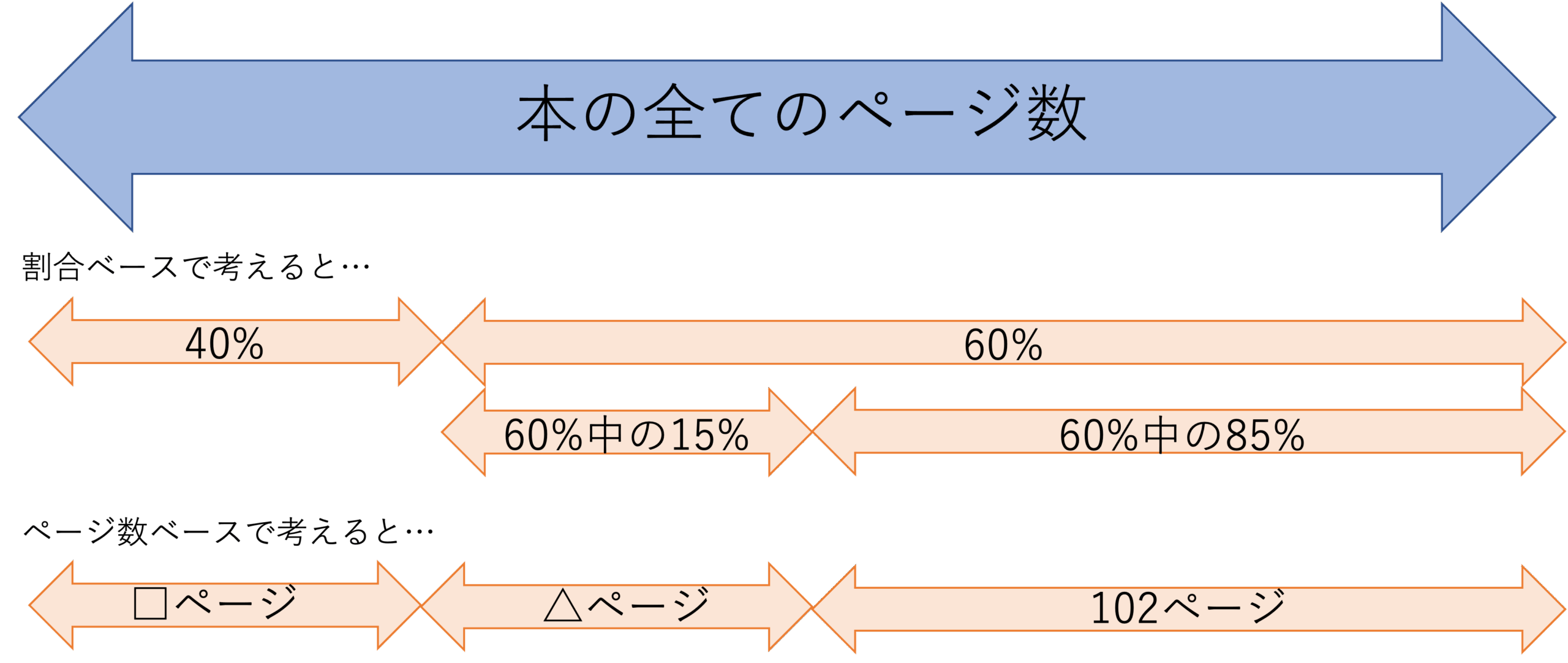 線分図を書く上でまず大切なことが,全体を示すものは何かを把握することです。全体というと分かりづらいかもしれませんが,問題の基準というと伝わるでしょうか。今回の問題では本のページ数というのが全体に当てはまりますね。それは,本全体のページ数というものを基に,15%や102ページという単語が登場しているからです。