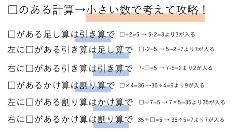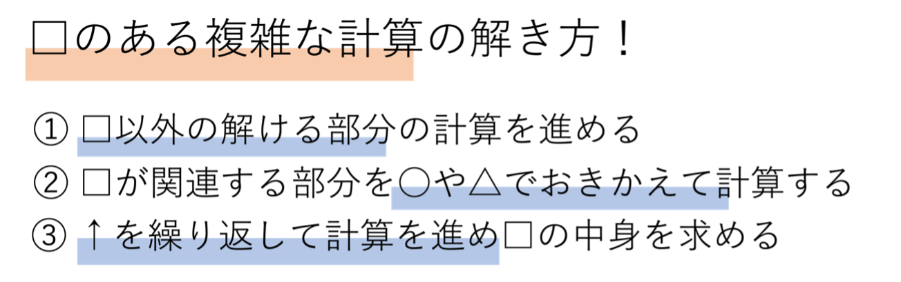 また□の含まれる複雑な計算に出会ったときの対処法もご紹介しましたね。それは□以外の解けるところから解いていく,そして□が含まれる部分を別の文字で置いて段階的に計算を進めるという方法でした。慣れてしまえばこのような回りくどい計算方法を取らなくてもいいのですが,ややこしい計算が簡単に解けるようになるまでは是非このやり方で問題に向き合ってみってください。